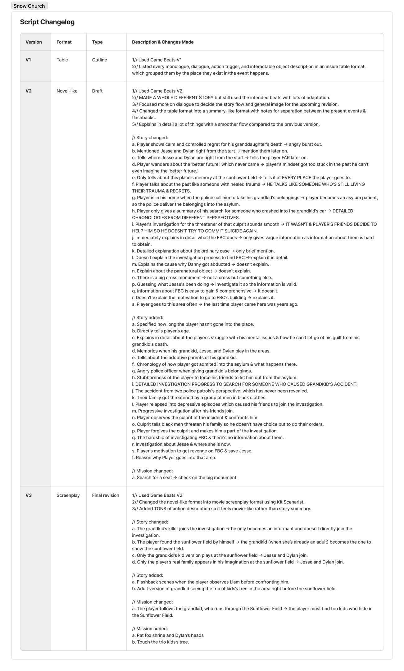 This game writing project was made streamlined as the level design of Snow Church was made, so the playtesting phase on the level design directly affects the workflow and the game writing progress.