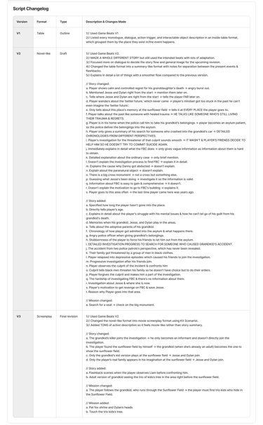 The new screenwriting was made based on the updated concepts and the playtest analysis from the blockout phase. It resulted in a massive revision of the screenplay.